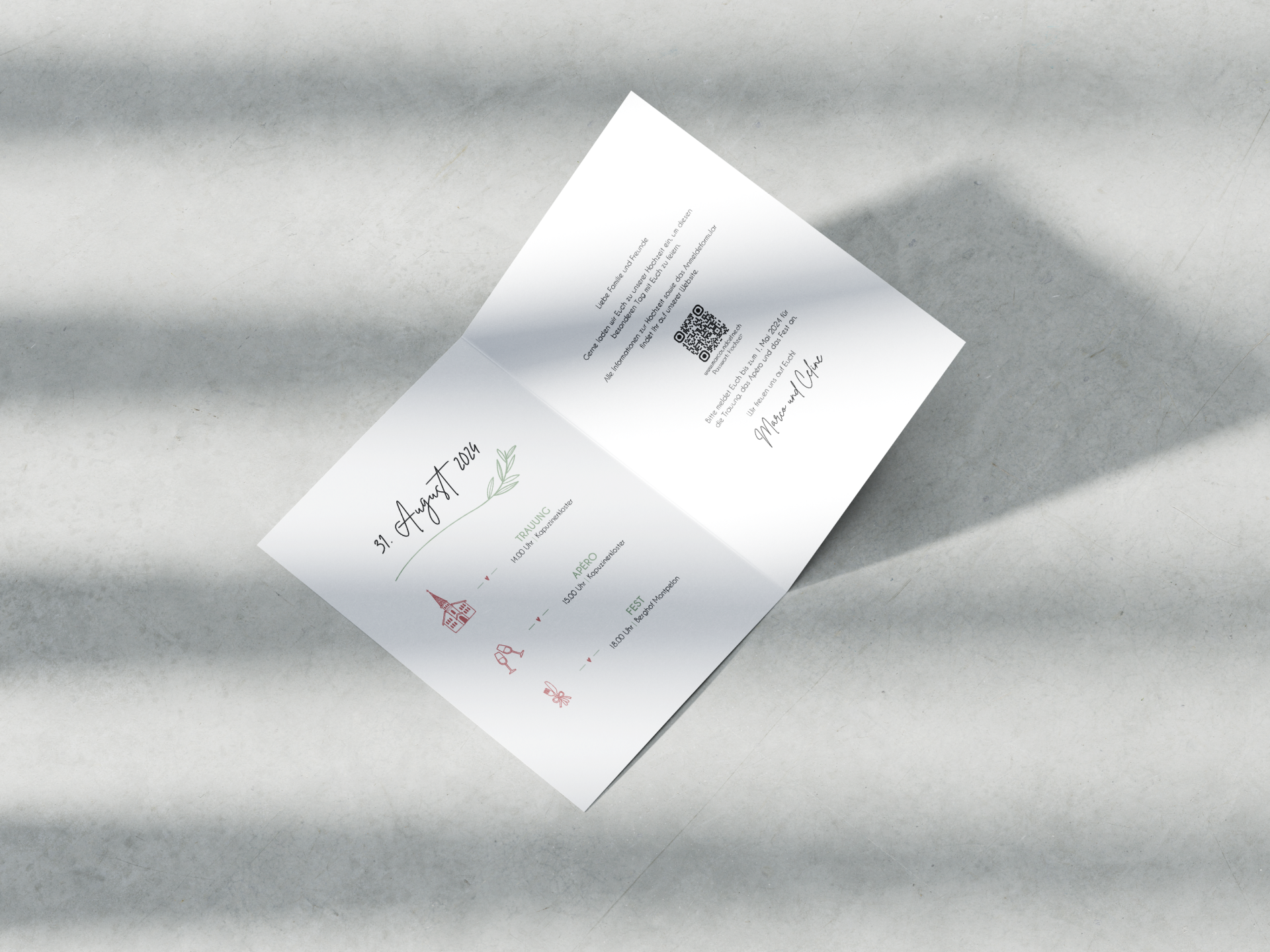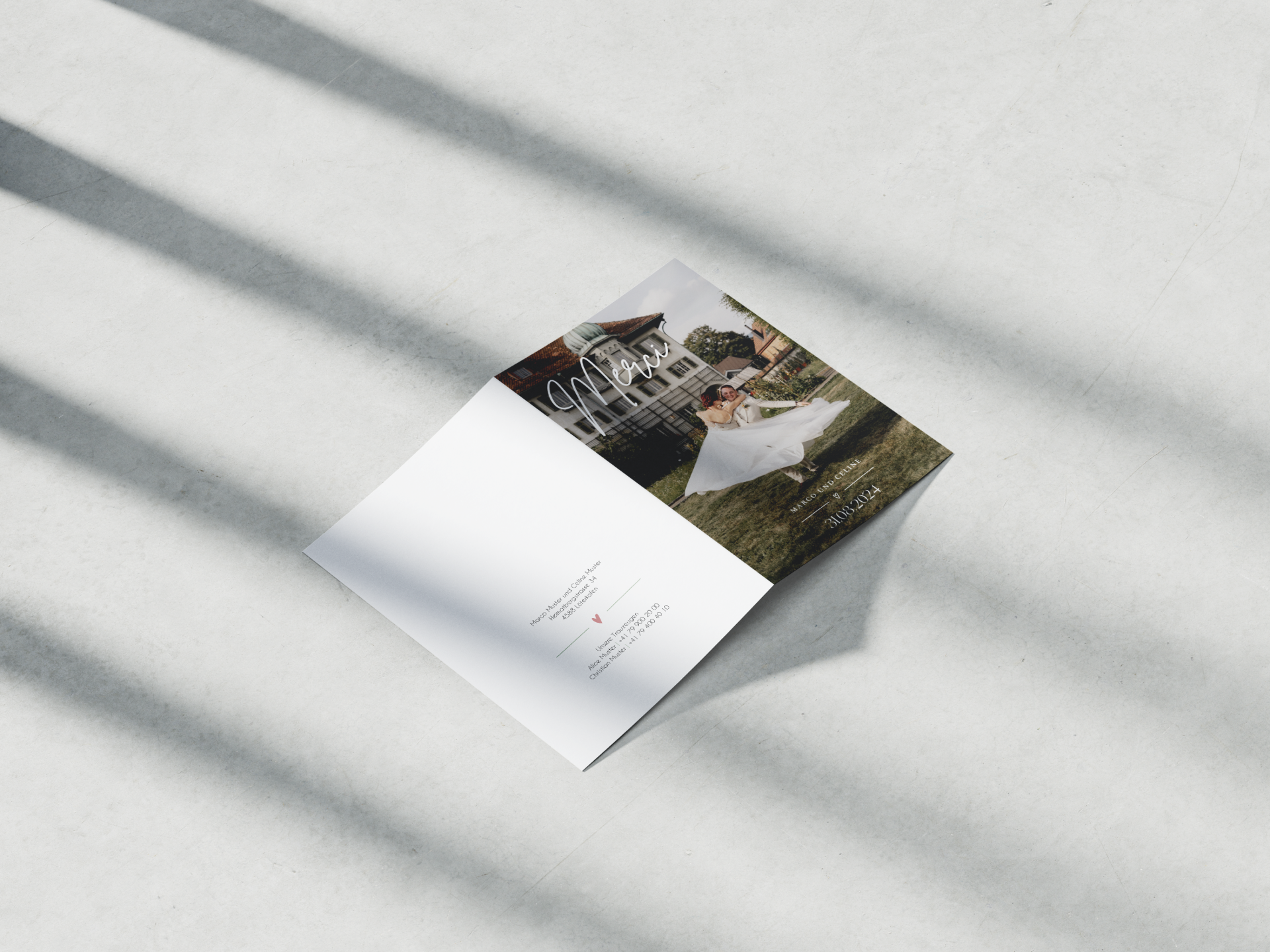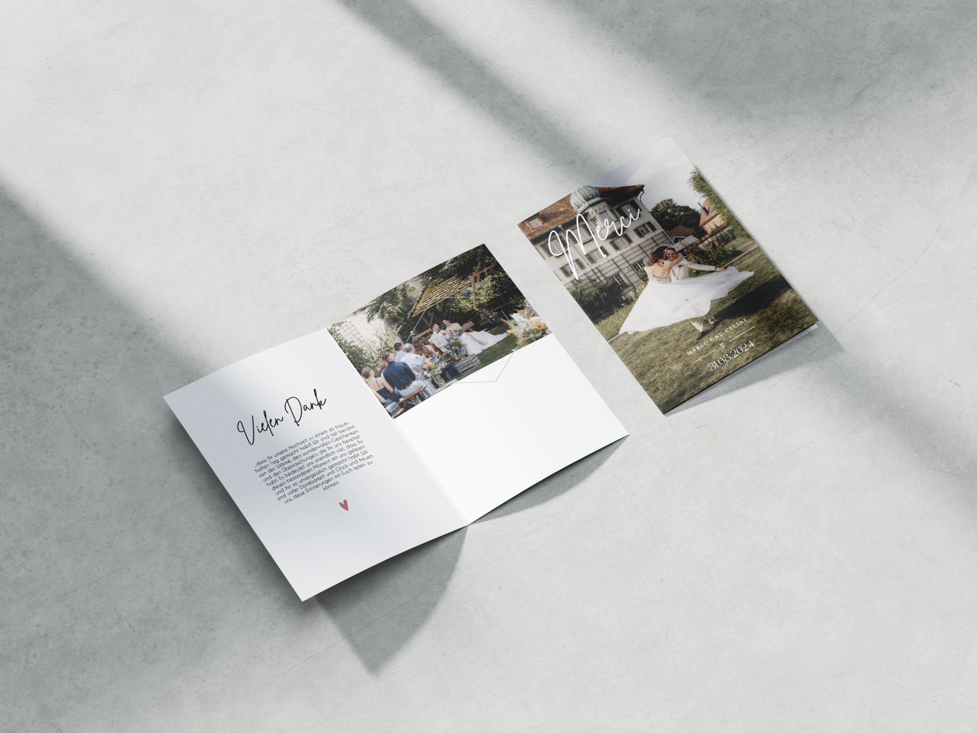 Für Celine und Marco durfte ich die komplette Gestaltung vom Save the Date über die Hochzeitseinladung bis hin zum Dankeschärtli übernhemen.